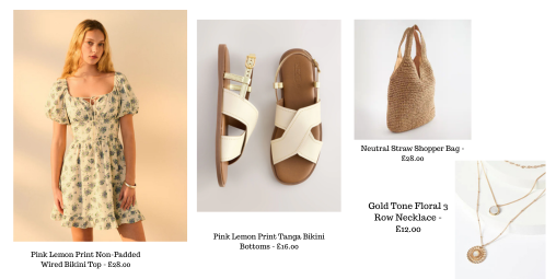 print bikini, paired with a breezy pink shirt and short cover-up for a fresh,