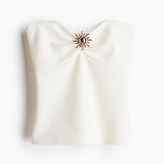 Turn up the heat with this cream tube top, featuring a striking gold sun metal detail that adds the perfect touch of shine. 😍☀