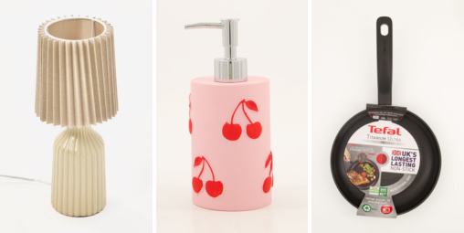 (Left to right: Cream Ceramic Table Lamp - £14.99, Pink & Red Cherries Soap Dispenser - £7.99, Black